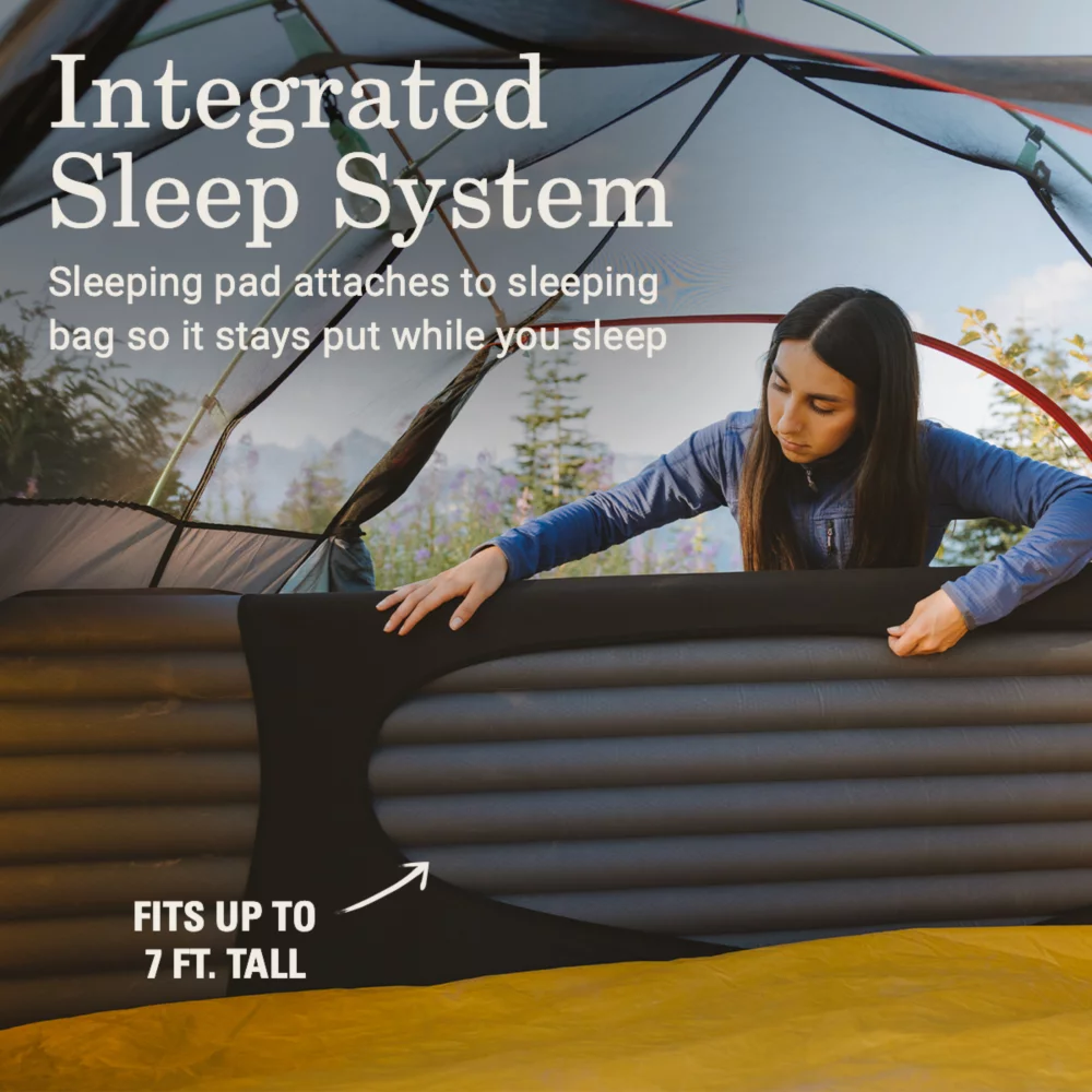 - INTEGRATED SLEEP SYSTEM: Sleeping pad slides into sleeping bag so it stays put while you sleep